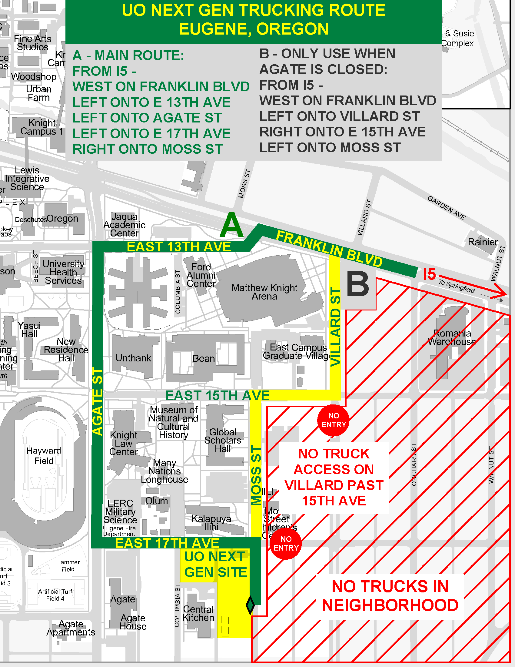All construction-related vehicles are provided instructions on appropriate roads to take to and from the construction site, which you can view on this map of the Next Gen Housing project trucking route. If you see construction vehicles on nearby neighborhood streets not directed on this map, let us know – email Karen Hyatt at khyatt@uoregon.edu.